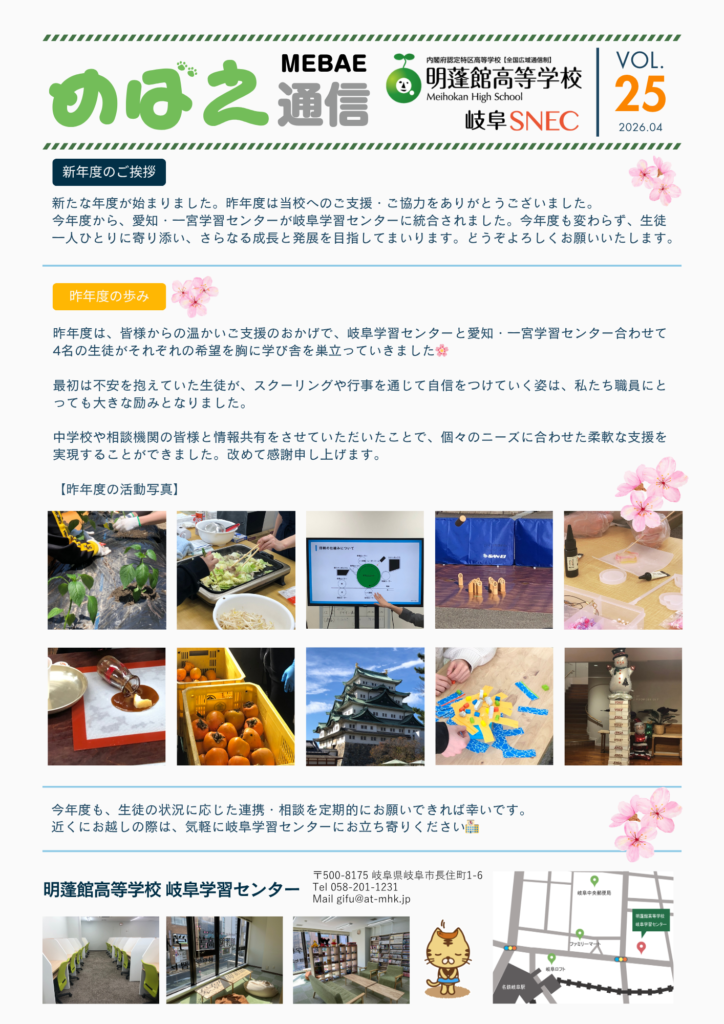 4月になり岐阜SNECのめばえ通信が発信されます!VOL. 25では新年度のご挨拶とともに、昨年度を振り返ります。