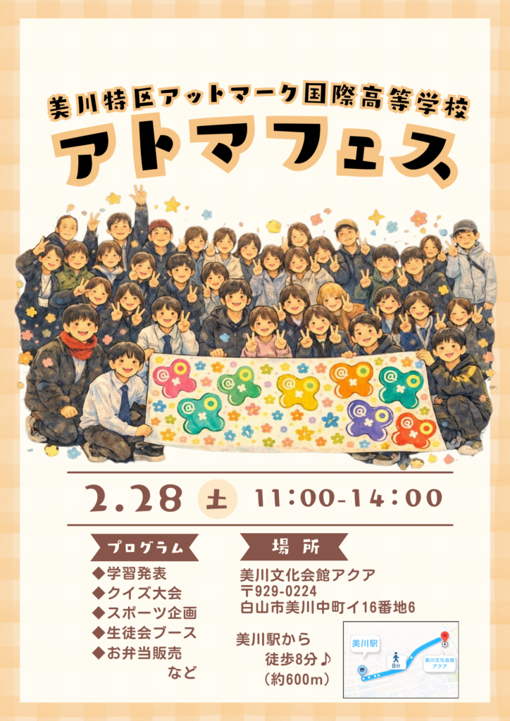 改めて、2月28日(土)にアットマーク国際高等学校の文化祭「アトマフェス」が開催されます🎉
