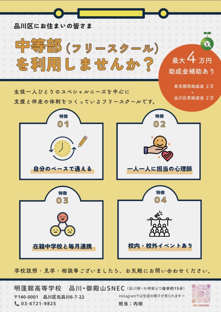 東京都と品川区のフリースクール助成対象(最大4万円)となります。